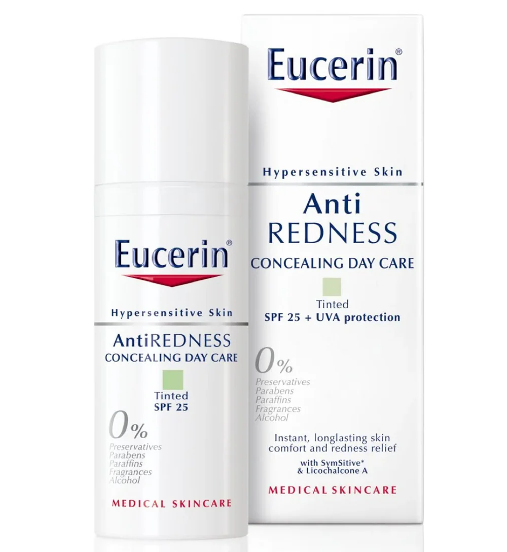 Eucerin AntiREDNESS Concealing Day Care SPF 25 has been especially developed for hypersensitive and Rosacea/Couperose-prone skin. Applied after cleansing, it instantly calms irritation and covers visible redness. This innovative formula combines two active ingredients – SymSitive* and Licochalcone A.